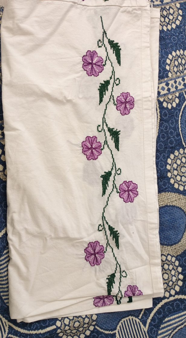 Beyaz zeminde mor çiçekler ve yeşil yapraklarla bohem tarzda nakışlı kumaş.