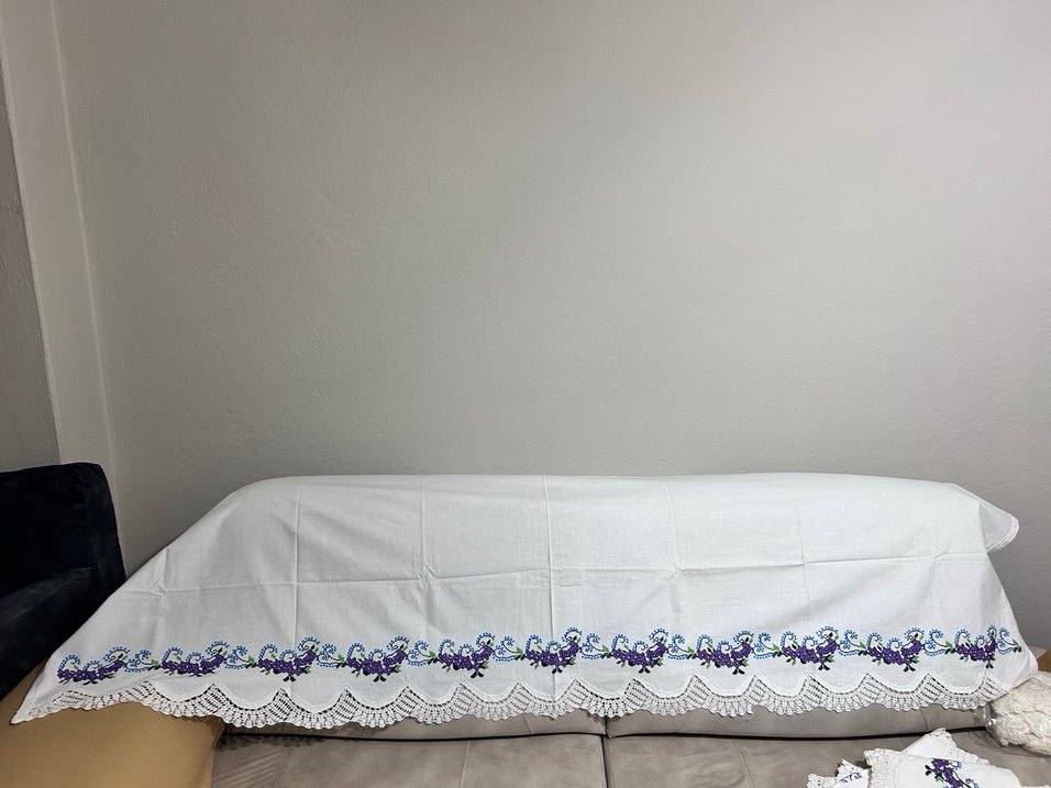 El yapımı kaneviçe çeyizlik set.bir adet uzun yastık kılıfı 35x95. 3 adet yatak kenarı örtüsü bulunmaktadır.Yatak kenarlarının ölçüleri 95x180 85x190 85x200 Toplamda 4 parçadır.