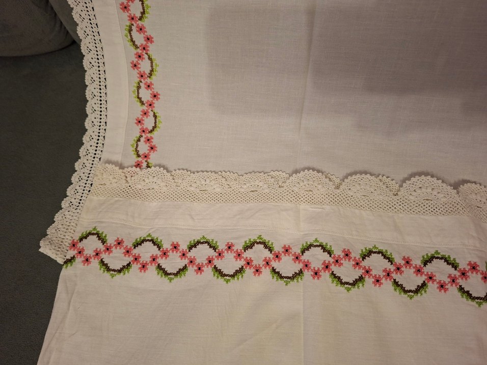 Kaneviçe elemeği, iki tam tur Nakışlı küstüm yastık, bir adet yastık örtüsü. hiç kullanılmadı.