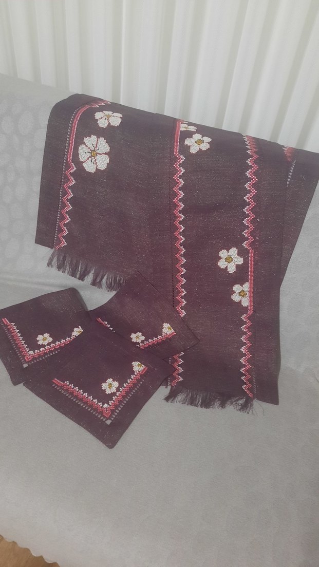 çiçek desenleri ve püsküllü kenarlarla bohem tarzını yansıtıyor. Koyu tonları ve dokuma kumaşıyla retro bir görünüm sunar. 4 parca runner konsol 2 sehpa