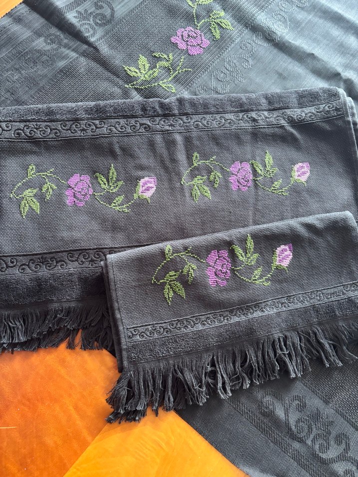 Siyahrenkte, mor çiçek ve yeşil yaprak nakışlı, püsküllü kenarlara sahip klasik havlu seccade seti.