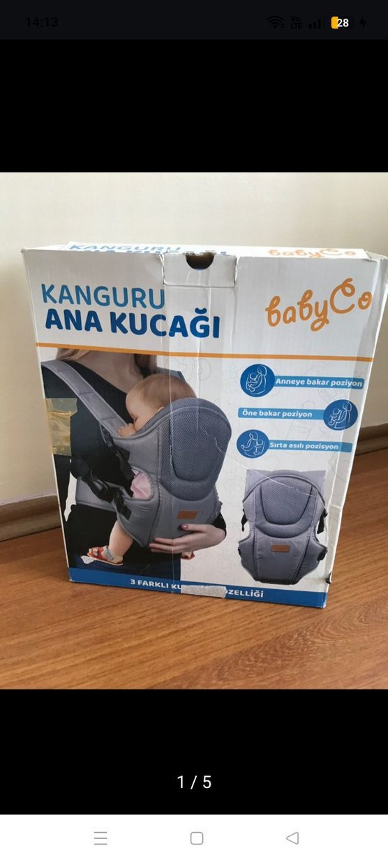 Gri renkte, anneye bakan, öne bakan ve sırt taşıma olmak üzere 3 farklı pozisyon seçeneği sunan babyCo marka bebek kangurusu. sadce bir kere kullanıldı
