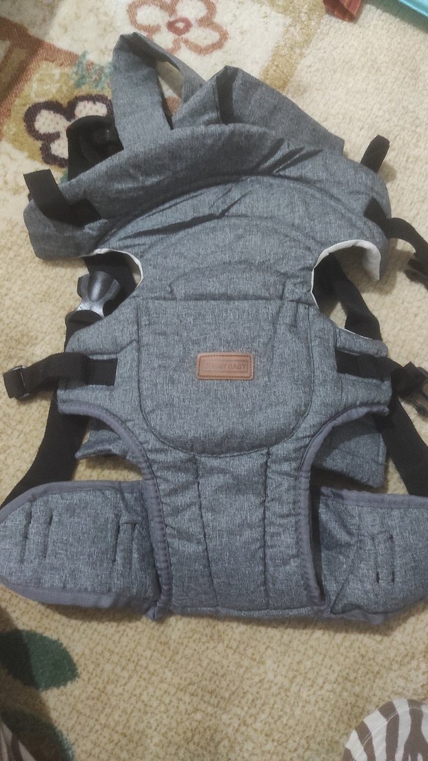 Gri renkli bebek taşıyıcı, yumuşak dolgulu askılar ve destekleyici bel kemeri ile rahat taşıma sağlar. Ayarlanabilir tokalar ve ön küçük cep bulunur.