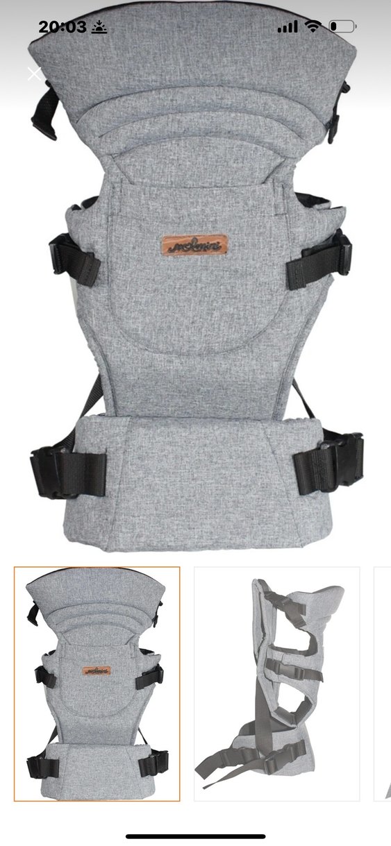 Ayarlanabilir kayışlara ve bel desteğine sahip gri bebek taşıyıcı, konforlu taşıma sağlar. Bebek ve küçük çocuklar için uygundur. Sadece birkaç kez kullanıldı tam destekli