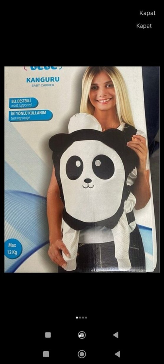 Panda desenli, 12 kg taşıma kapasiteli bebek taşıyıcı. Bel destekli ve iki yönlü kullanım imkanı sunar.