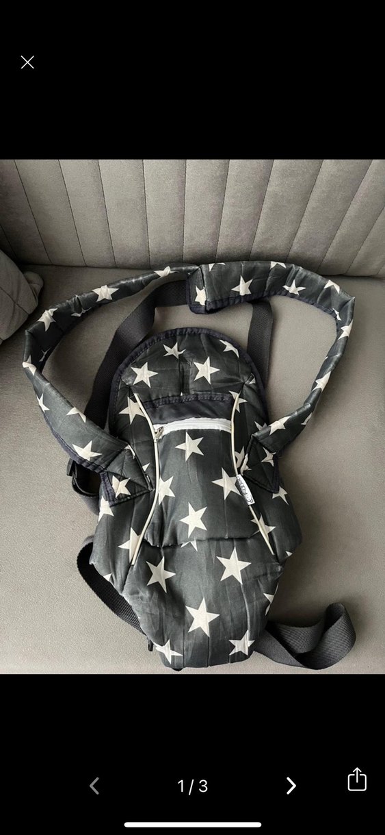 Gri renkli, beyaz yıldız desenli bebek taşıyıcı. Yumuşak dolgulu askılar ve ayarlanabilir siyah kayışlarla rahat ve güvenli kullanım sağlar. ⭐