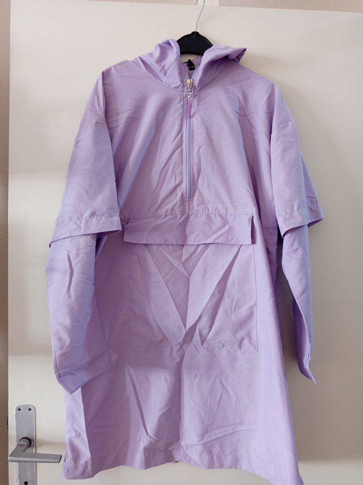 Pastel mor renkte, fermuarlı ve kapüşonlu, bol kesim uzun kollu midi yağmurluk. Sentetik kumaştan, günlük kullanıma uygun şık bir dış giyim parçası.