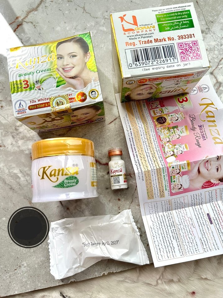 Kans Güzellik Kremi seti, nemlendirici krem, küçük serum şişesi ve bilgilendirme broşürünü içerir. Cilt görünümünü iyileştirmeye ve nem sağlamaya yöneliktir.