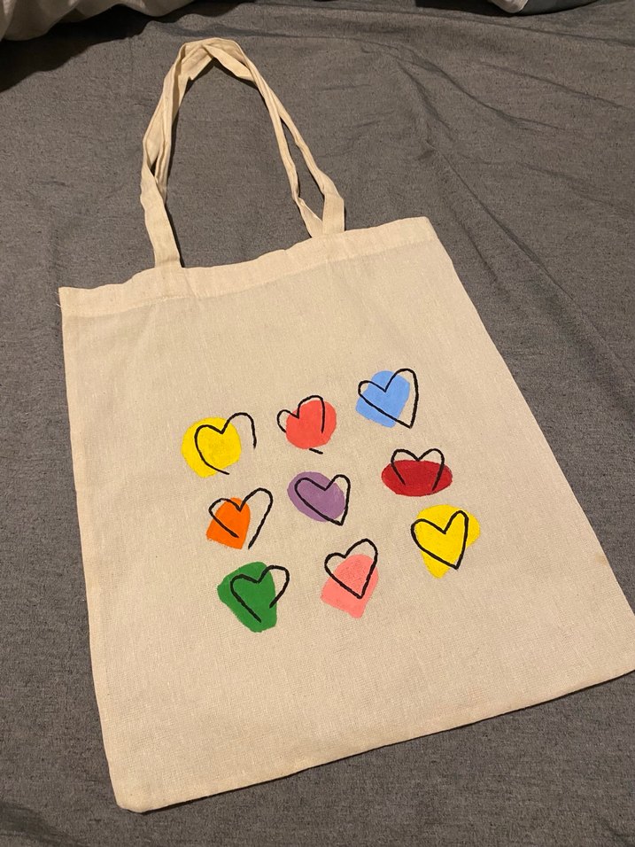 Pamuklu, renkli kalp desenli kadın çantasıdır. Bohem ve minimalist tarzı günlük kullanıma uygundur.