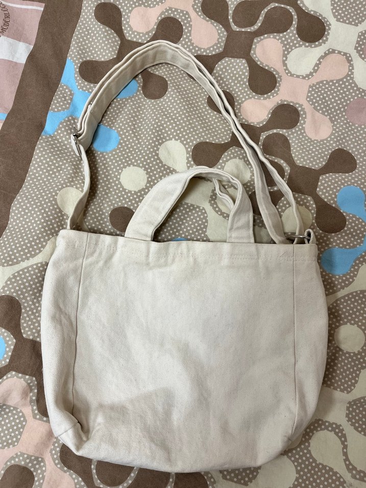 Beyaz pamuk kumaştan, desensiz, çift saplı ve ayarlanabilir omuz askılı günlük kullanıma uygun kadın çantası.