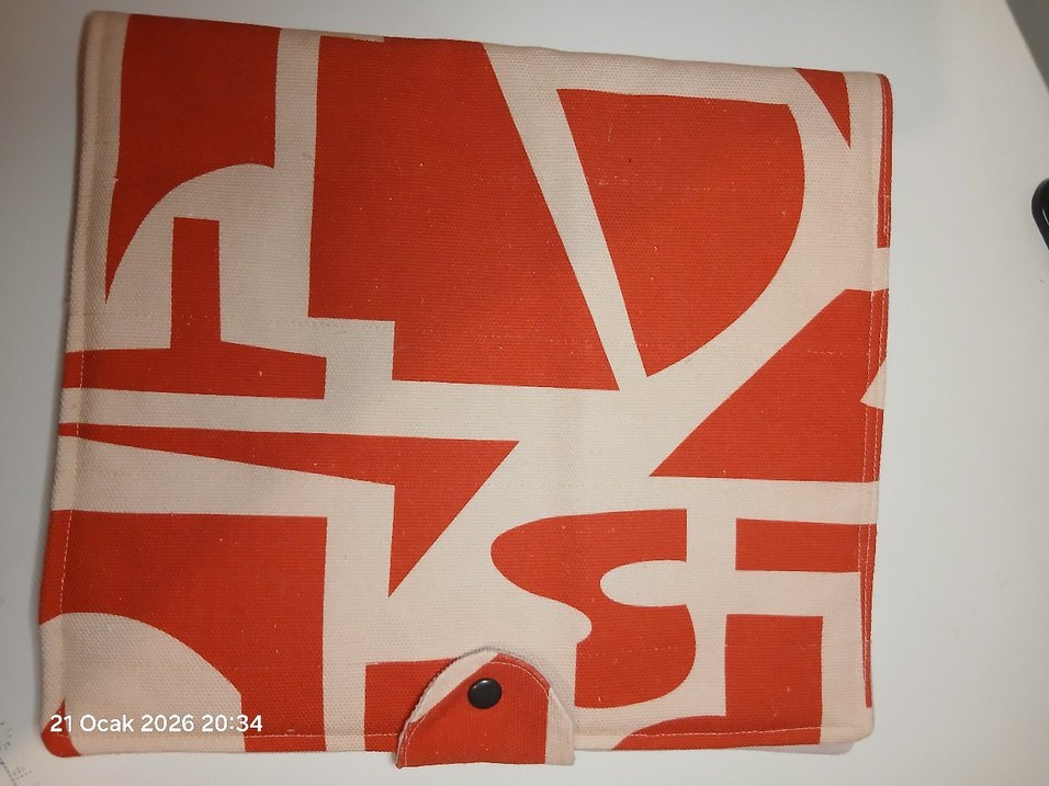 Kanvas kumaş kapaklı, büyük kırmızı-beyaz soyut desenli ve çıtçıtlı kapaklı