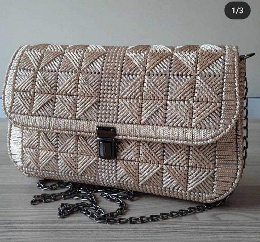 Nakışlı geometrik desenlere sahip bej örgü kadın çanta, metal zincir askılıdır ve günlük kullanım için uygundur. istenilen renkte boyutta ve modelde yapılır.