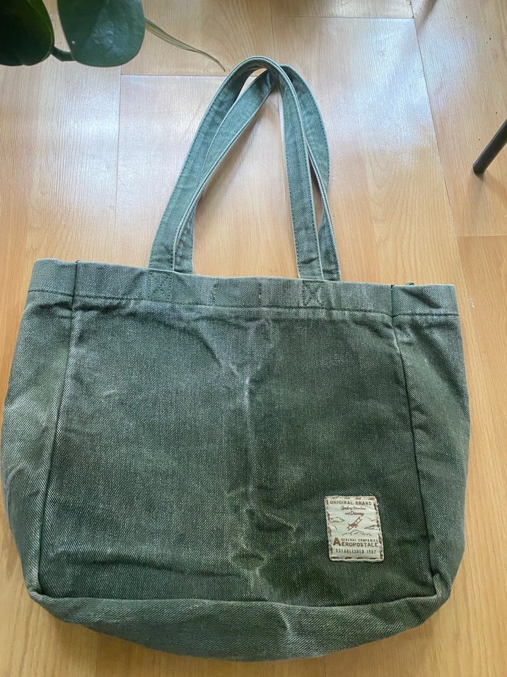 Yeşil denim malzemeden yapılmış, desen içermeyen, sokak modası tarzında kadın çantası. Günlük kullanım için rahat ve sade bir şıklık sunar.
