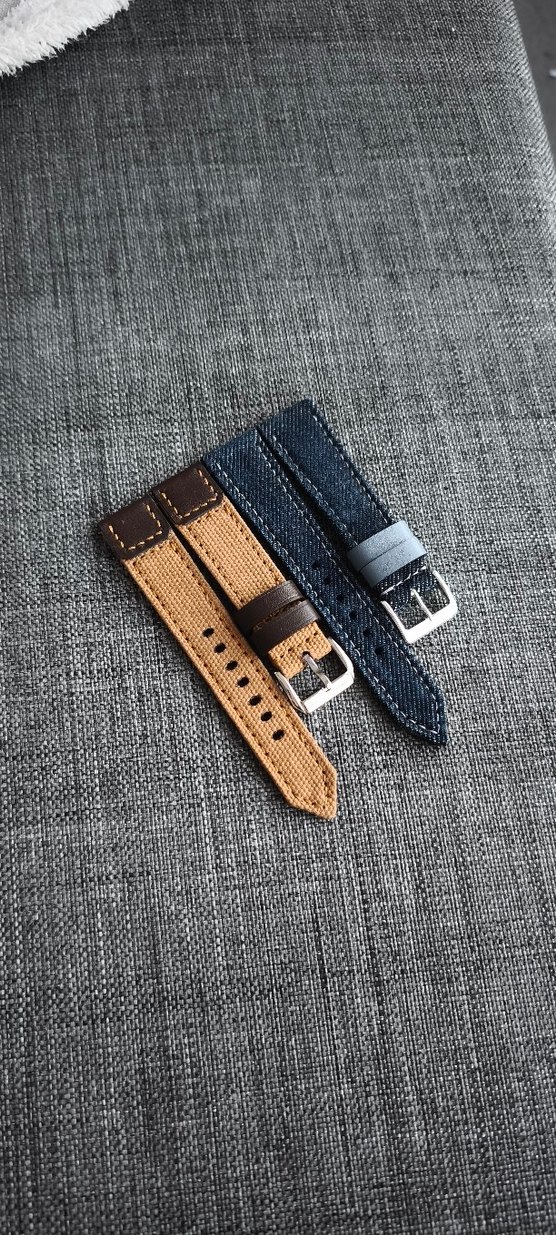 sıfır denim ve kanvas saat koridnlari sağdaki 22 mm pim 16 mm toka soldaki 20 pim 18 toka olcusunde . sıfır el yapımı 2 kat kaliteli uzun süre kullanacağınız şekilde usta işi soldaki 1200 sağdaki 1100 TL dir