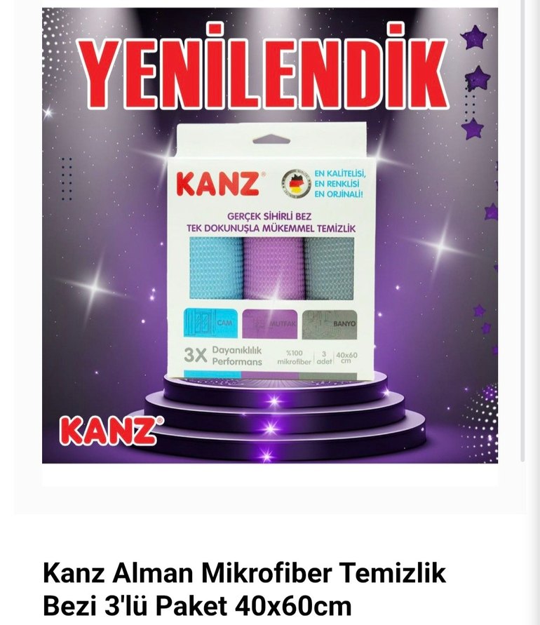 Kanz markasının 40x60 cm boyutunda, 3'lü paket halinde soldan sağa açık mor mikrofiber temizlik bezleri. Tek dokunuşla etkili temizlik sağlar.