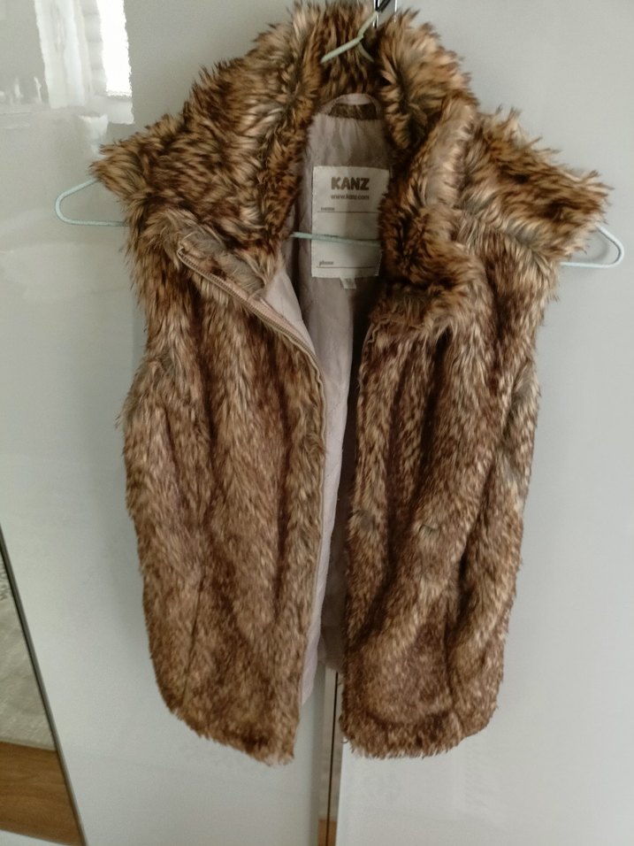 Kürklü detaylı, bej renkte, kolsuz ve vücuda oturan çocuk yelek. Yumuşak sentetik kumaştan, günlük sokak stili için uygundur. Hiçbir sorunu yoktur.