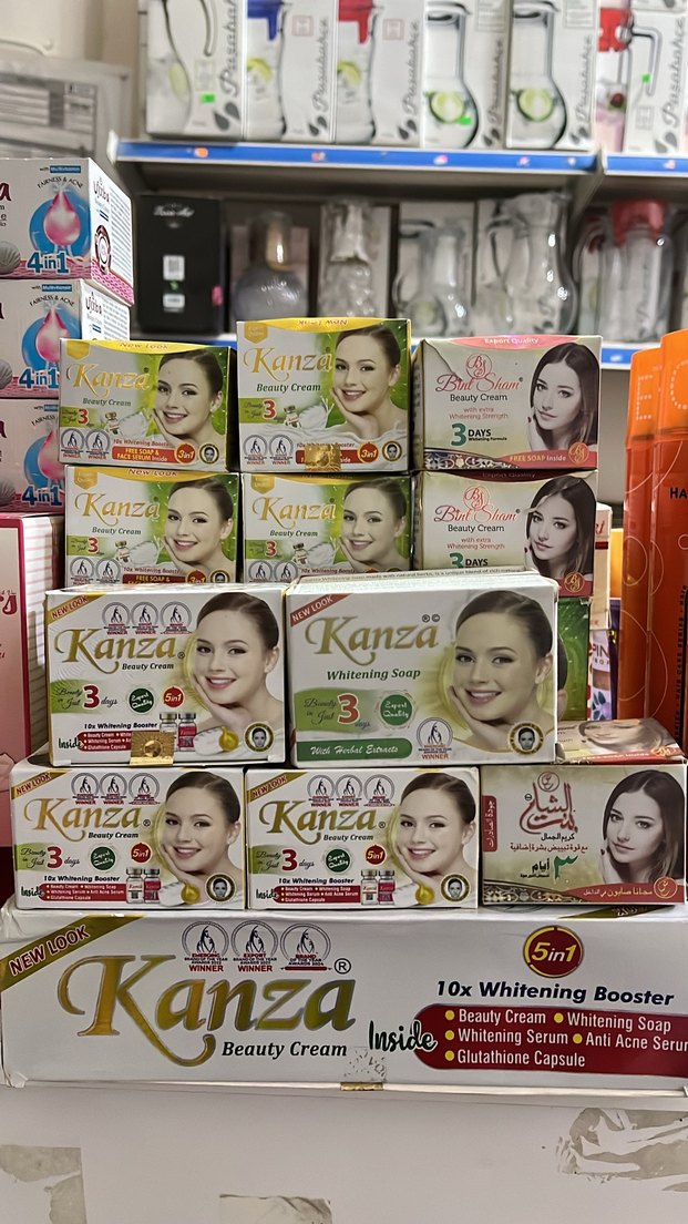 Kanza Güzellik Kremi seti, cilt beyazlatıcı krem, sabun, serum, akne karşıtı sabun ve glutathion kapsül içerir.