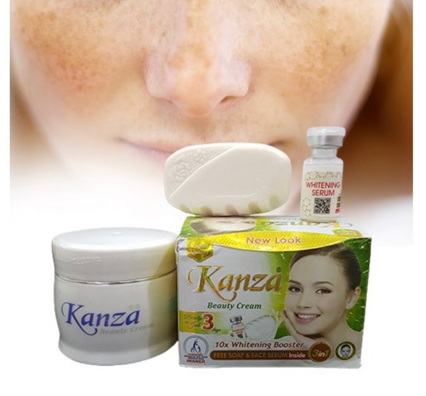 Kanza Beyazlatıcı Serum ve Güzellik Kremi seti, cilt beyazlatmayı artıran sabun ve yüz serumu içerir. 3'ü 1 arada çözüm sunar. ✨.
