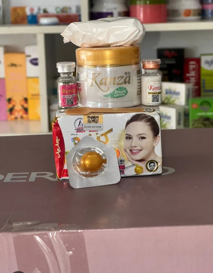 Kanza cilt bakım seti, cilt görünümünü ve sağlığını destekleyen krem, serum ve kapsüller içerir.