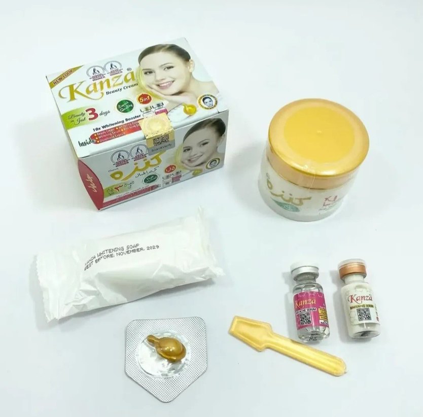 Kanza güzellik seti krem, sabun, serum ve aplikatör içerir. Cilt görünümünü iyileştirmeye yönelik ürünler sunar.