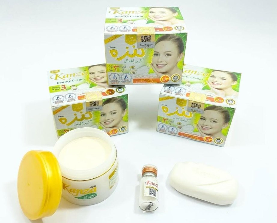 Kanze beyazlatıcı yüz kremi seti, krem, serum ve sabun içerir. Cilt aydınlatma ve bakım için uygundur.