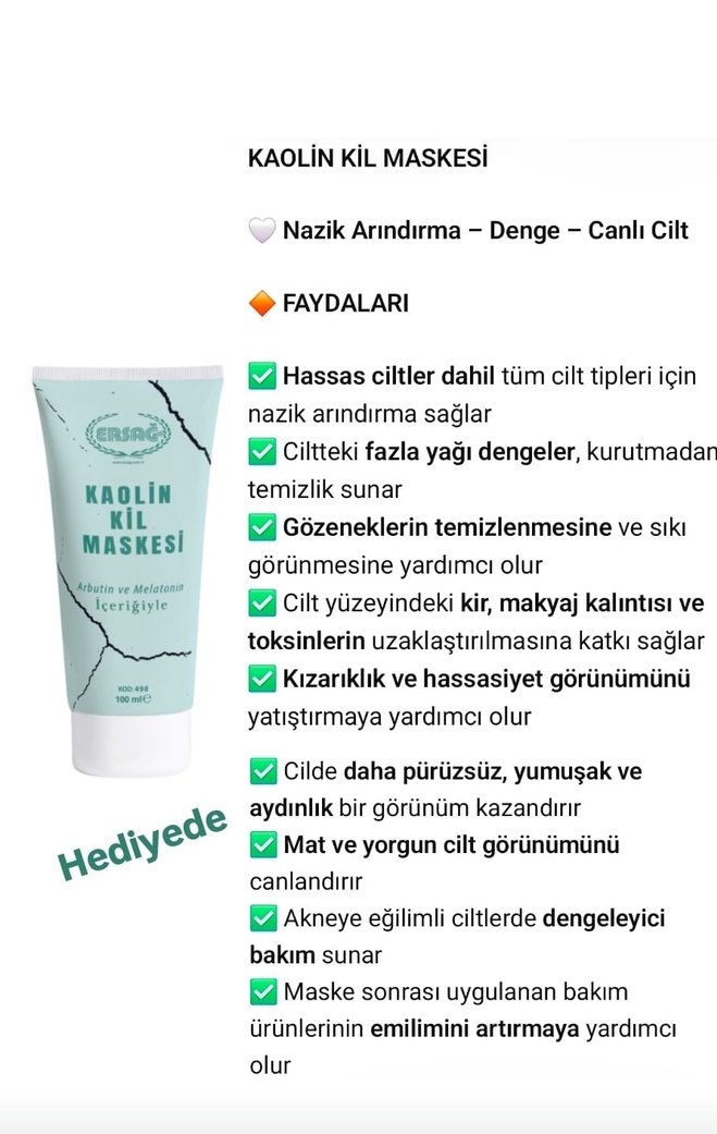 Kaolin Kil Maskesi, cildi nazikçe arındırır, fazla yağı dengeler ve kurutmadan temizlik sağlar. Gözenekleri temizler, kızarıklığı yatıştırır, cilde pürüzsüzlük ve aydınlık kazandırır. Hassas ve akneye eğilimli ciltler için uygundur, maske sonrası bakım ürünlerinin emilimini artırır.