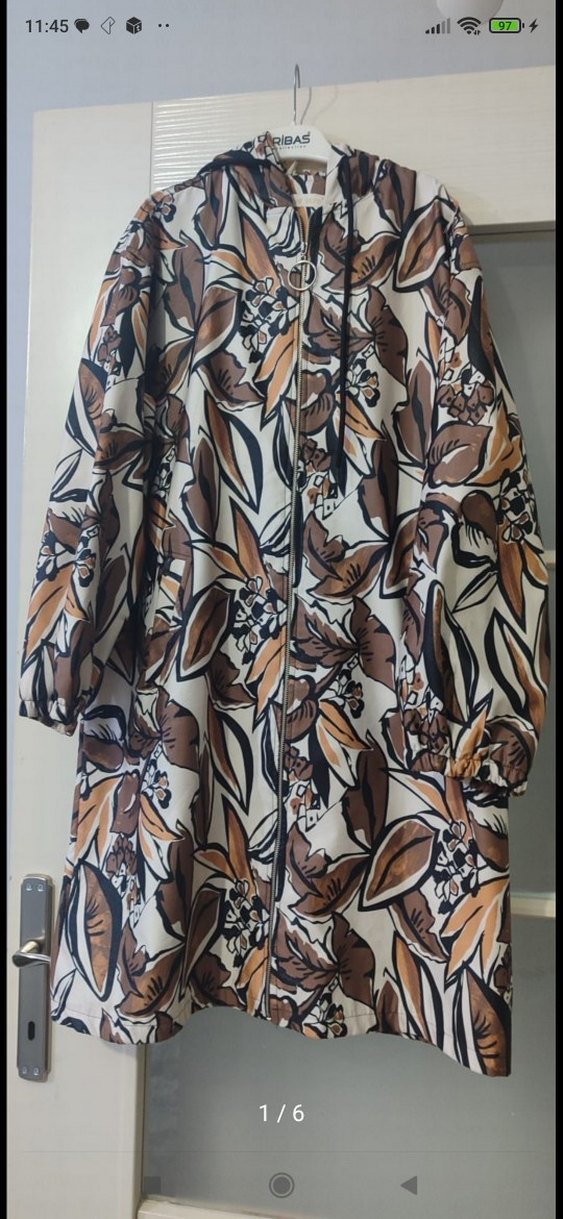 Uzun, bol kesim yüksek yakalı ve uzun kollu. Sentetik kumaştan, koyu kahverengi baskılı, drapeli tasarım. Günlük bohem tarz için uygun. 46 48 beden için uygundur