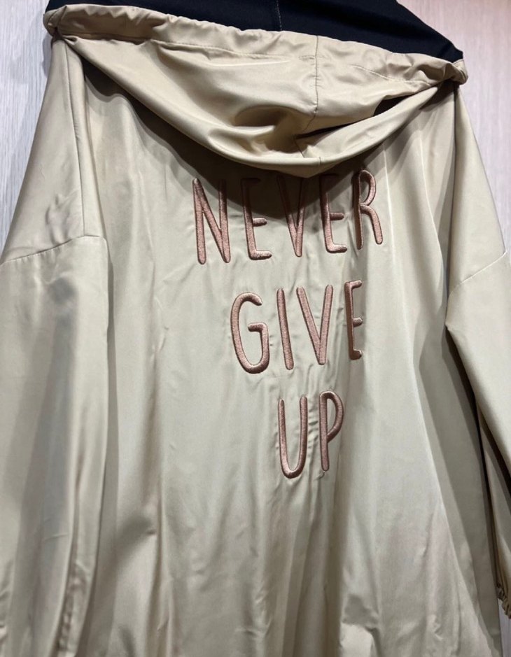 Uzun kollu, kapüşonlu ve fermuarlı bej ceket. Parlak yüzeyli, sırtında "NEVER GIVE UP" yazısı bulunur. Rahat ve bol kesimdir. ✨