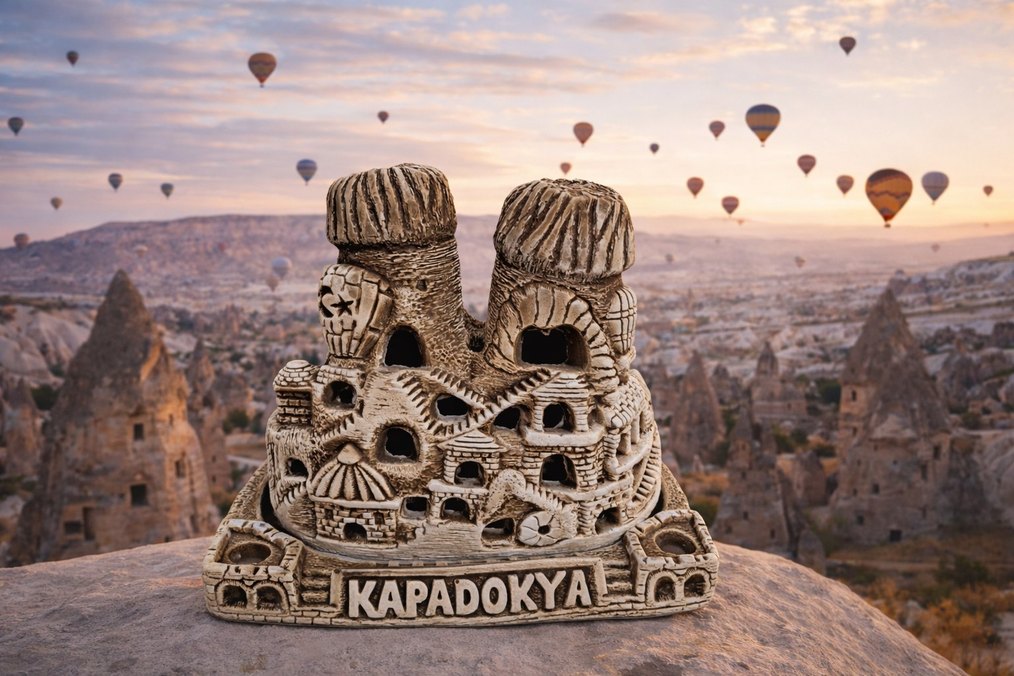 Kapadokya'nın eşsiz kaya oluşumlarını detaylı mağara evleri ve üzerinde "KAPADOKYA" yazısı bulunur.