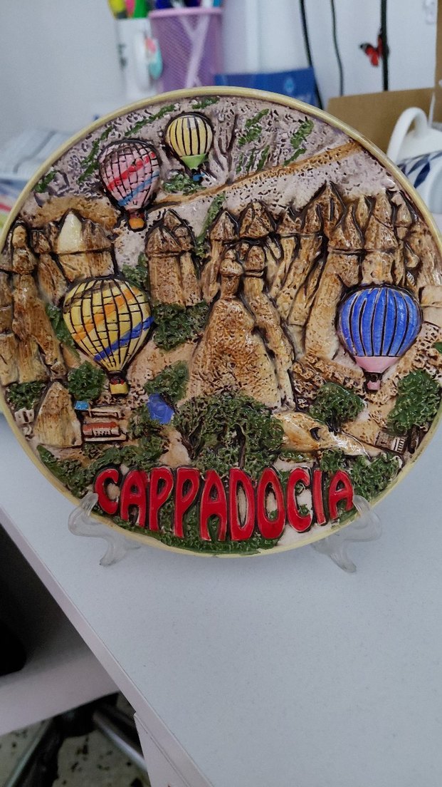 Kapadokya'nın eşsiz kaya oluşumları ve renkli sıcak hava balonlarının yer aldığı bohem tarzda el yapımı dekoratif tabak. Üzerinde kırmızı büyük harflerle 'CAPPADOCIA' yazıyor. ayakligi ile yollanır.