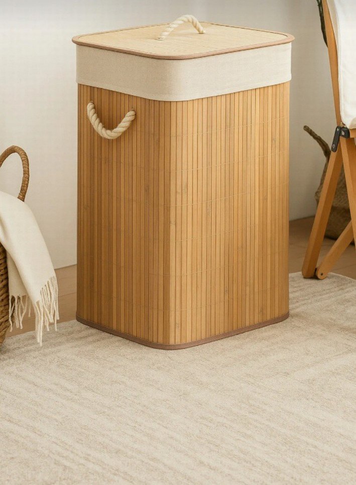 Kapaklı ve ip tutacaklı, doğal dokuma malzemeden yapılmış bej renkli saklama sepeti. Alanınızı düzenlemek için pratik ve şık bir seçenek. paketli üründür bambu çamaşır sepeti..35x60 cm boyutları..