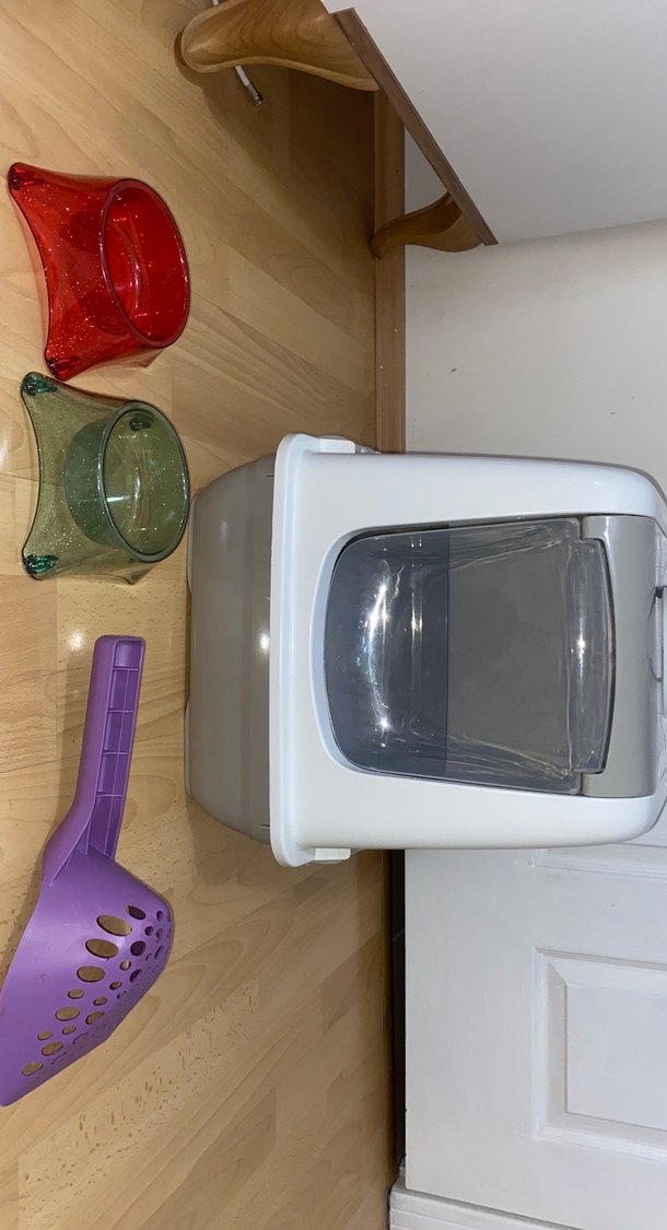 Şeffaf kapaklı beyaz kedi tuvalet kabı, kırmızı ve yeşil mama kabı ile mor kürek. Temizlemesi kolay ve kullanışlıdır. Kesi 1 hafta kullandı ginede temizliği yapılıp gönderilir:) Yanında mama kabı ve eleme aleti verilir ürünün sıfır 700 tl dir.