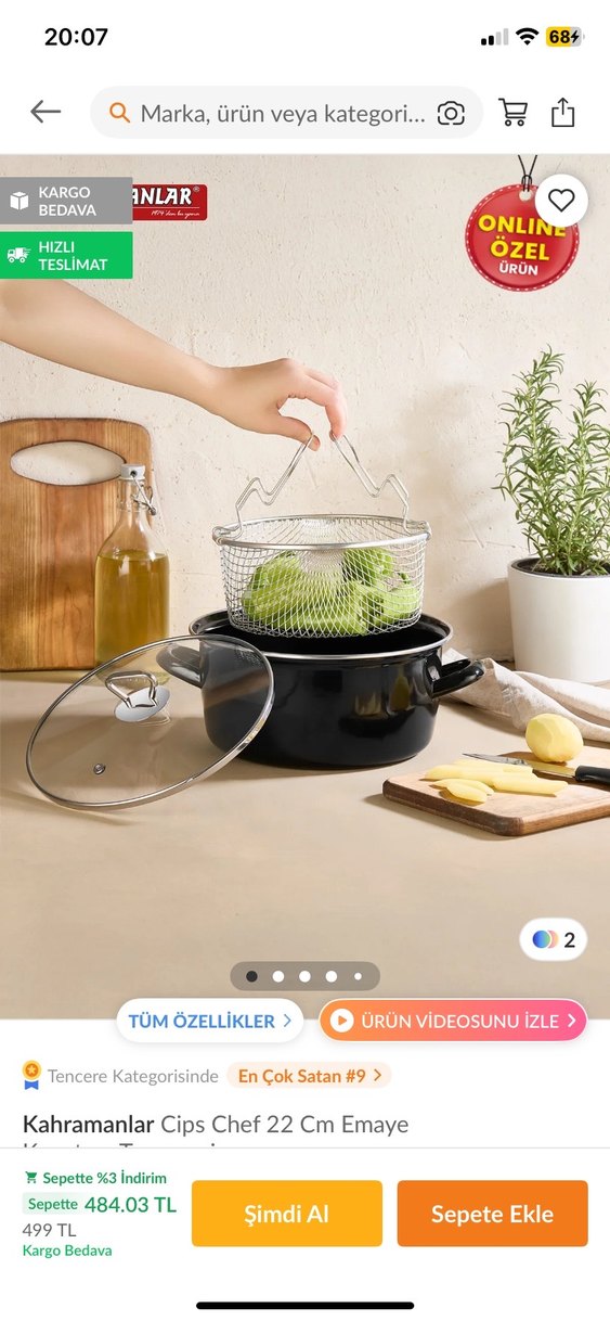 Cam kapak ve metal sepetli gri-khaki tencere, hızlı teslimatlı ve en çok satan ürünler arasında yer alıyor.