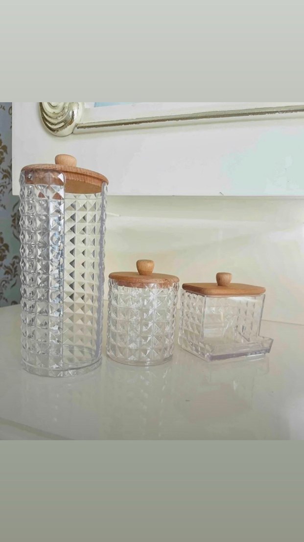 Şeffaf dokulu mika gövdeli ve açık bej renkli ahşap kapaklı üçlü organizer seti. Sormadan alım yapmayın lütfen sınırlı stok mevcut