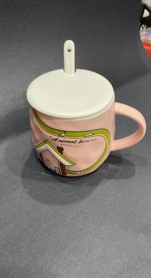 Pembe renkte, hayvan evi desenli kupa. Beyaz kapak ve kaşık ile birlikte sunulur. Sıcak içecekler için uygundur. ☕