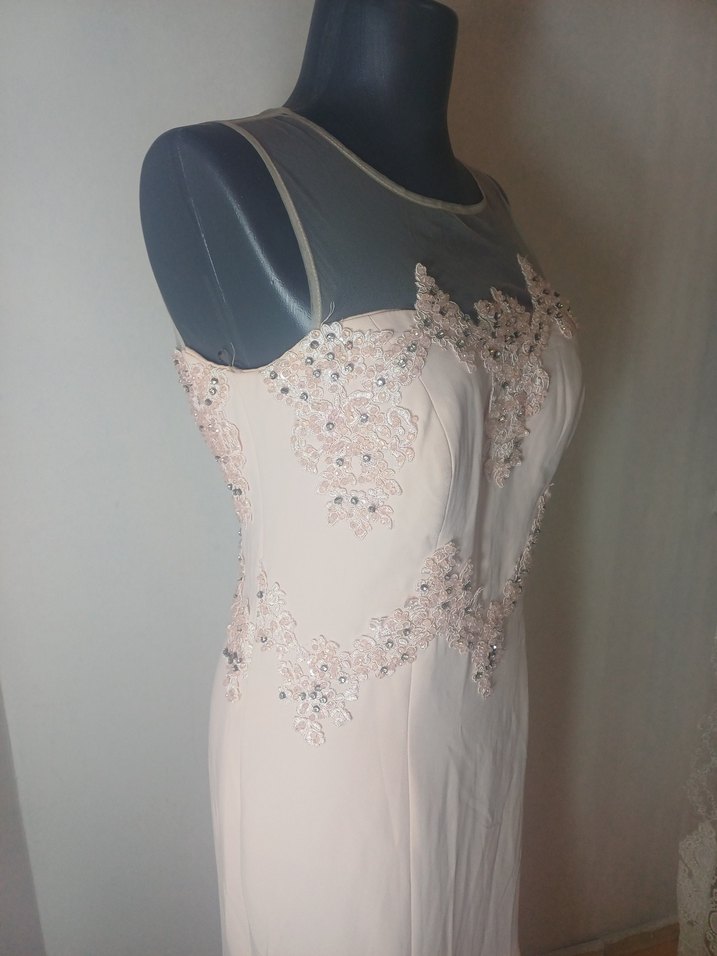 Dantel işlemeli, kolsuz ve vücuda oturan bej uzun abiye elbise, düğünler için uygundur.