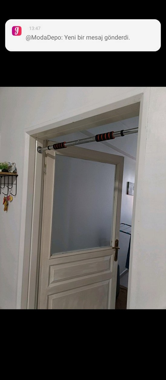 Kapı üstüne monte edilen, köpük tutacaklı gri çekme çubuğu. Evde güç antrenmanı için kullanılır. ️♂️