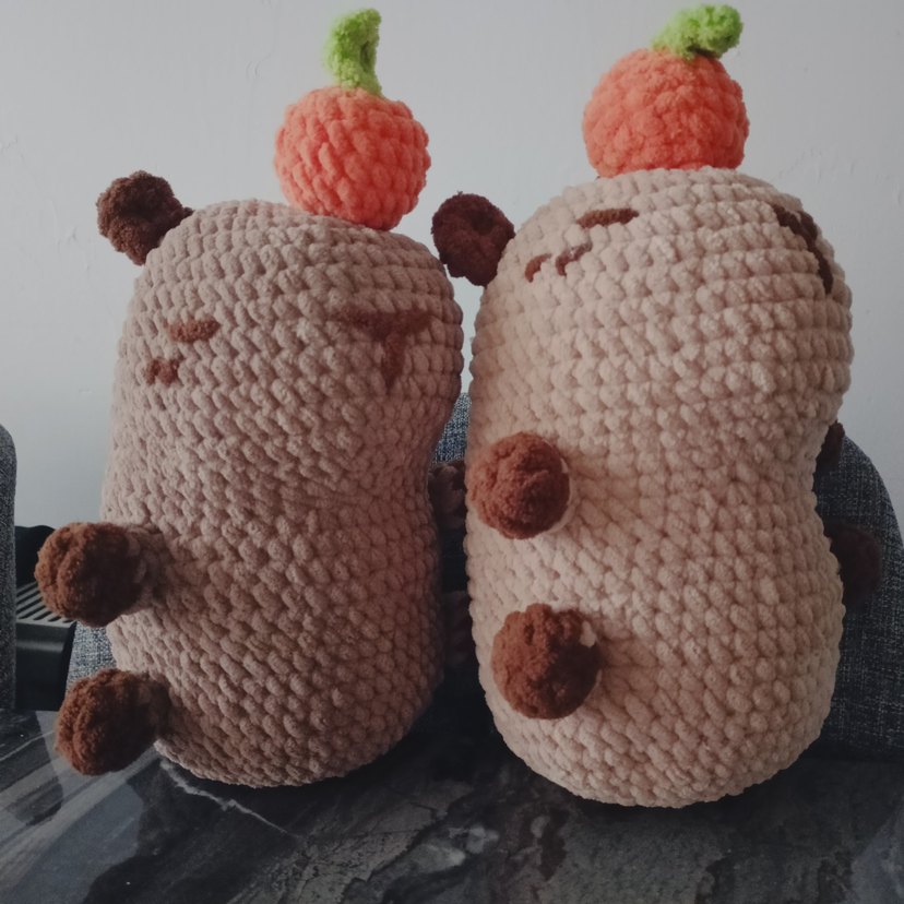 Yumuşak pastel kahverengi peluş oyuncaklar, üstünde sevimli meyve tasarımları, küçük kulaklar ve yuvarlak şekillerle. Rahat dekorasyon veya oyun için uygundur.