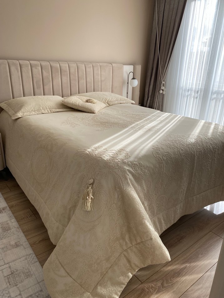 Beyaz renkli, parlak ve desensiz yüzeye sahip yatak örtüsü, yatak odasına yumuşak bir şıklık katıyor. ️