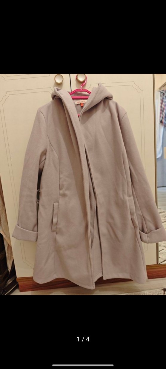 açık mor renkli kadın kaban,sadece bir kere giyildi kapüşonlu ve yumuşak, sıcak tutan kumaştan. Uzun kesim, yan cepler ve sade şıklık sunar. Soğuk havalar için uygundur.
