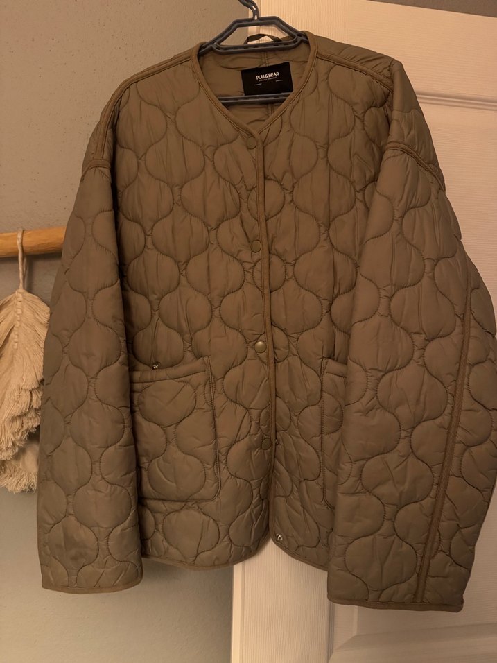 Çıtçıtlı, uzun kollu haki kadın ceket. iki ön cep ile rahat ve gündelik bir tarz sunar. Günlük kullanım için uygun.