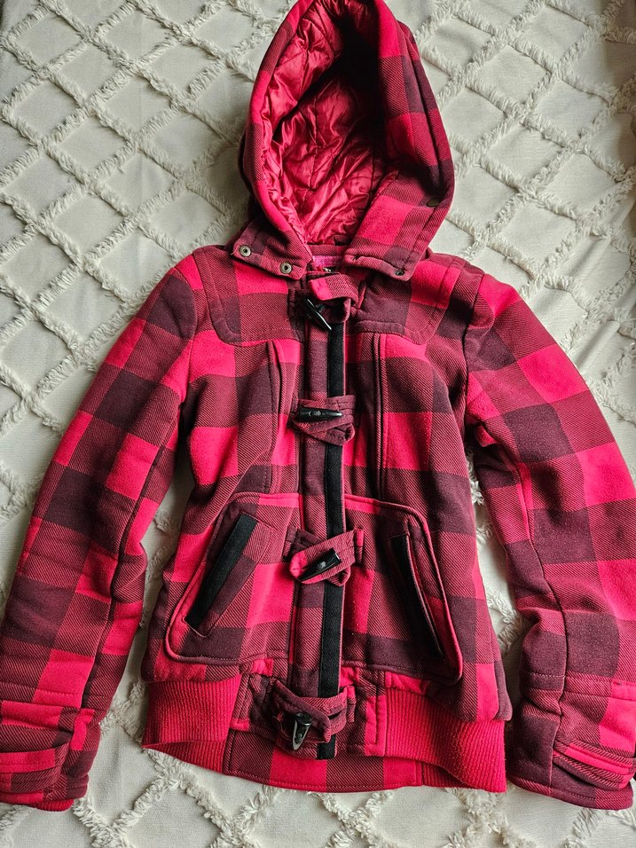 Kapüşonlu, kemerli, fitted kesim kırmızı kareli kadın ceket. Yumuşak ve sıcak dokulu kumaştan, günlük kullanıma uygun normal boyda.