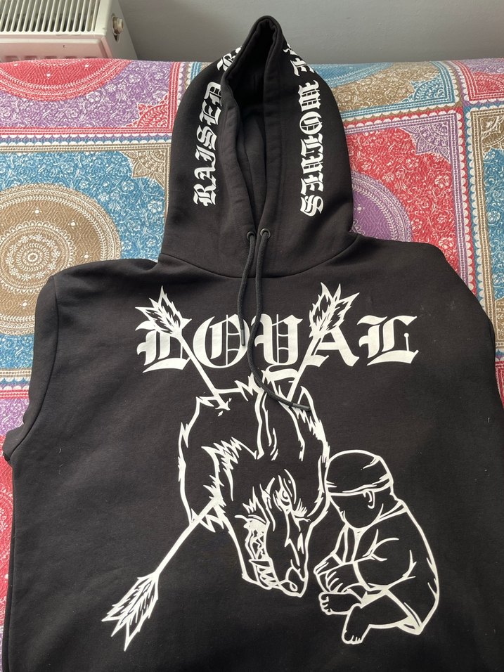 Kemer detaylı, kapüşonlu ve beyaz baskılı siyah kapitone sweatshirt. Rahat kesim, yumuşak dokulu kumaştan üretilmiştir. ✨
