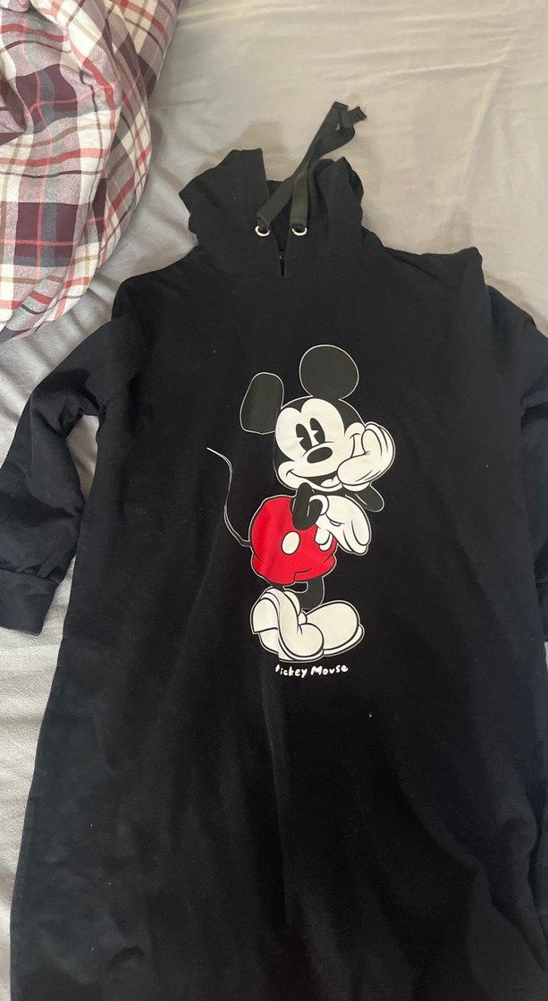 Siyah kapüşonlu sweatshirt, uzun kollu ve düğmeli detaylıdır. Önünde Mickey Mouse baskısı bulunur, yumuşak ve sıcak kumaştan günlük kullanıma uygundur.