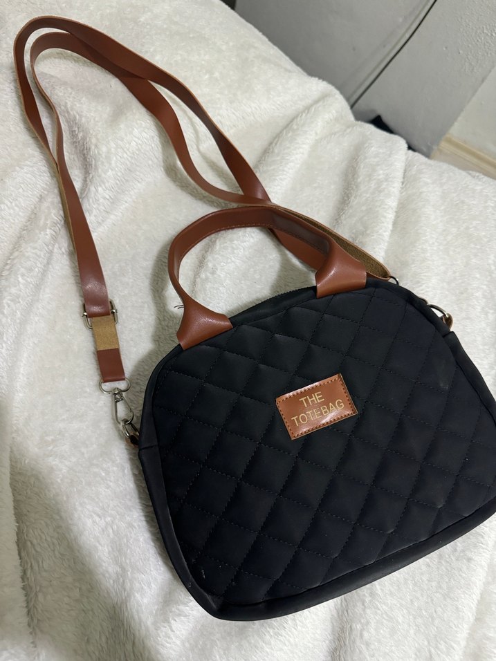 Siyah deri kadın çanta, kapitone dikiş detaylı, kahverengi tokalı saplara sahip. Baskılı deseni ve çıkarılabilir askısıyla sokak modasına uygun.0 üründür mağaza ürünü