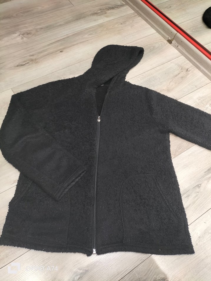 Siyah kapüşonlu ceket, yumuşak ve sıcak kumaş, fermuarlı ve uzun kolludur. Salaş kesimi ve sade deseniyle günlük rahatlık sunar.