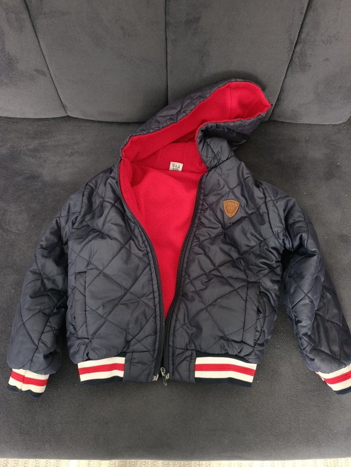 Kapitone desenli, kapüşonlu ve fermuarlı bu erkek çocuk montu, koyu gri dış yüzey ve kırmızı iç astar ile trend bir görünüm sunar.