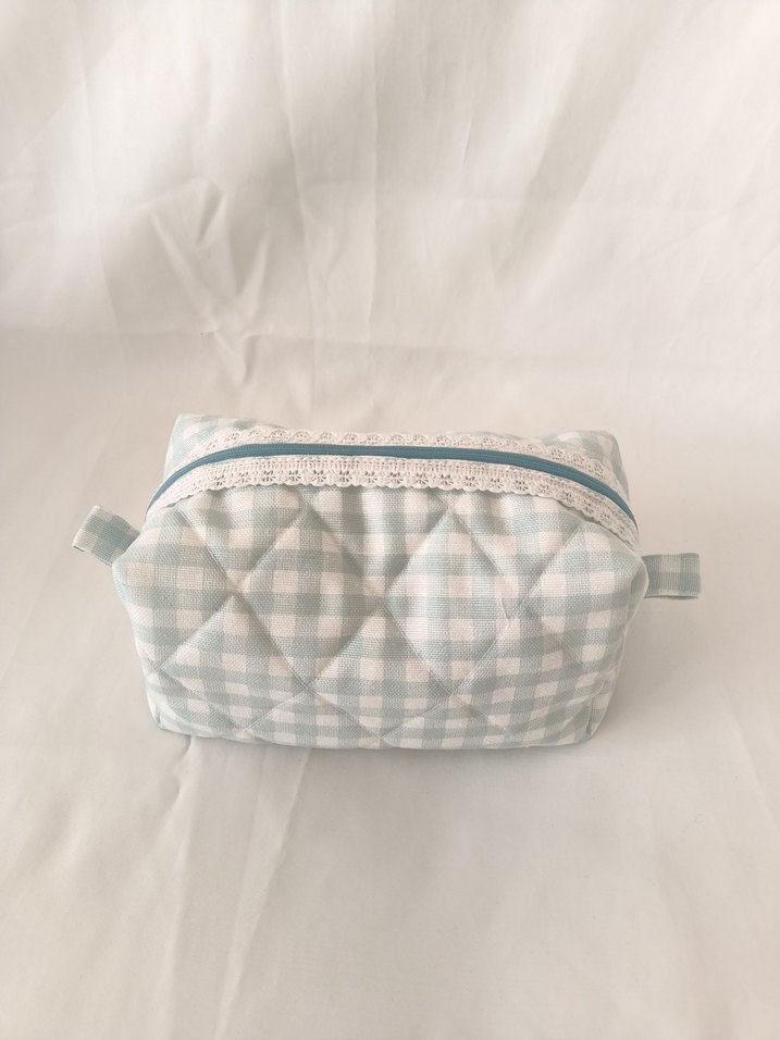 Pamuk kumaştan yapılmış pastel mavi kareli makyaj çantası, fermuarlı kapama ve vintage tarzıyla günlük kullanıma uygundur.