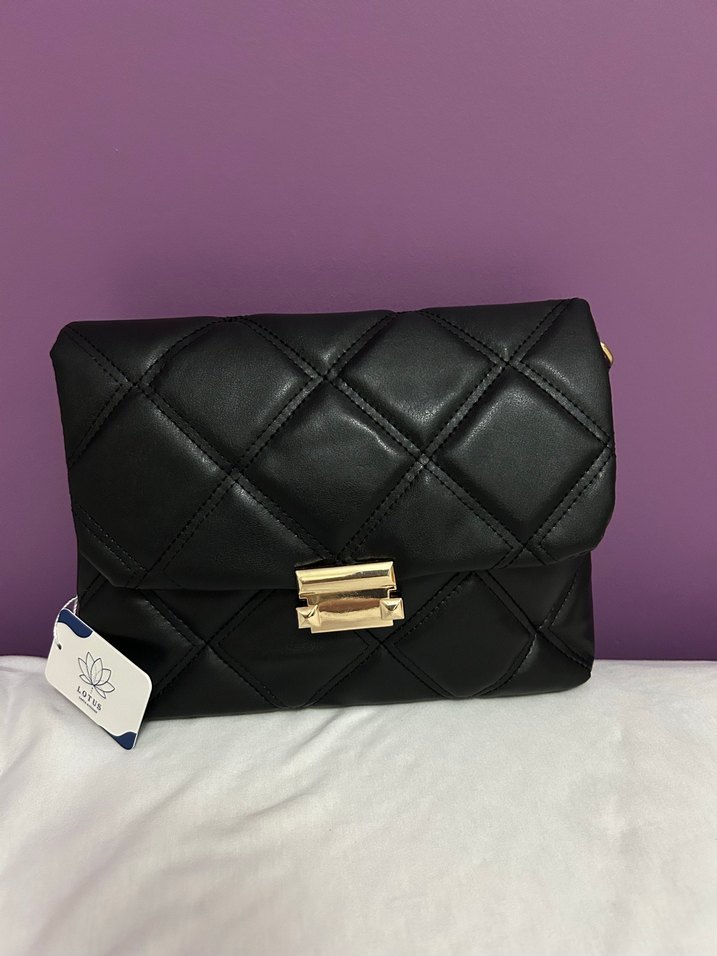 Kapitone desenli siyah çapraz çanta. Sıfır ürün etiketi mevcut
