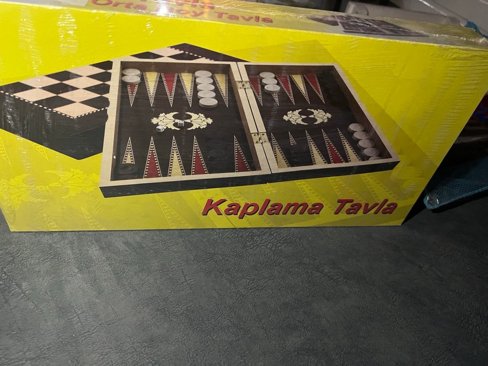 Kaplamalı siyah tavla seti, beyaz ve kırmızı puanlar ile beyaz pullar içerir. Sıfır üründür